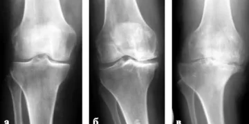 На рентгеновских снимках коленного сустава в начальной стадии артроза могут отмечаться легкие изменения, такие как сужение суставной щели и начало разрушения хряща. По мере прогрессирования заболевания становятся видимыми более серьезные изменения: утрата хряща приводит к увеличению костного контакта, образованию остеофитов и изменению контуров костей. На поздних стадиях рентгенография может показать обширные разрушения коленного сустава, а также деформацию и изменение положения костей. Важно отметить, что степень выраженности симптомов не всегда коррелирует с величиной изменений на снимках — у некоторых пациентов с серьезными рентгенологическими проявлениями может быть лишь незначительный болевой синдром, в то время как у других с минимальными изменениями может быть выраженная боль.